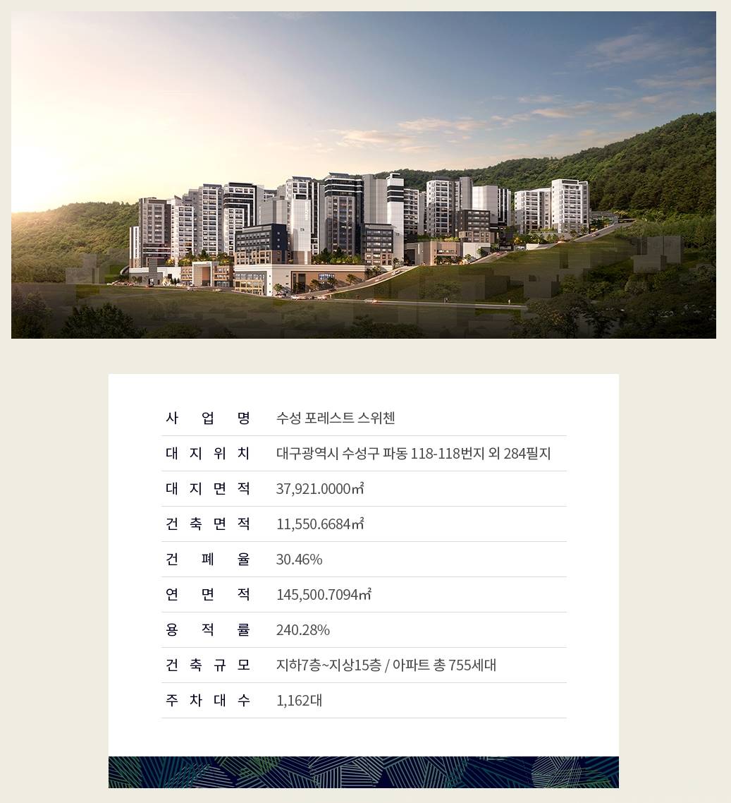 KCC 스위첸 브랜드의 수성구 첫 진출 명품 주거 지역에 선보이는 프리미엄 아파트 KCC건설의 스위첸 브랜드가 대구 최고 선호 주거지인 수성구에 처음으로 공급되어 높은 브랜드 가치와 품질을 약속합니다. 앞산과 신천을 품은 쾌적한 숲세권 도심 속에서 누리는 녹색 환경과 힐링 라이프 앞산의 맑은 공기와 신천 수변공원 등 풍부한 녹지 환경에 둘러싸인 천혜의 자연 환경을 자랑하며 주거 쾌적성이 뛰어납니다. 수성구의 명문 교육 특권 인접 경신고, 대구과학고 등 우수 학군 이용 편리 대구 최고의 학군을 자랑하는 수성구에 위치하여 명문 중·고교 접근성이 뛰어나 자녀 교육에 최적화되어 있습니다. 총 757세대 규모의 대규모 단지 안정적인 단지 관리와 풍부한 커뮤니티 조성 아파트 757세대 규모의 대단지로서 우수한 조경과 다양한 커뮤니티 시설을 효율적으로 운영할 수 있는 기반을 갖춥니다. 대구 지하철 3호선 수성시장역 인근 대구 도심 어디든 편리하게 연결되는 교통망 대구 도시철도 3호선 수성시장역이 인근에 위치하여 대구 주요 지역으로의 대중교통 이용이 매우 편리합니다. 신세계백화점 등 완벽한 생활 인프라 범어동, 동대구역의 풍부한 상권을 공유하는 입지 신세계백화점, 이마트 등 대형 상업시설과 범어네거리, 동대구역의 다양한 편의시설을 가까이에서 누릴 수 있습니다. 전 세대 남향 위주 배치의 쾌적 설계 채광 및 통풍을 극대화한 주거 만족도 높은 단지 남향 위주로 단지를 배치하여 일조량을 풍부하게 확보하고, 4Bay 혁신 평면(일부)으로 주거 쾌적성을 높였습니다.